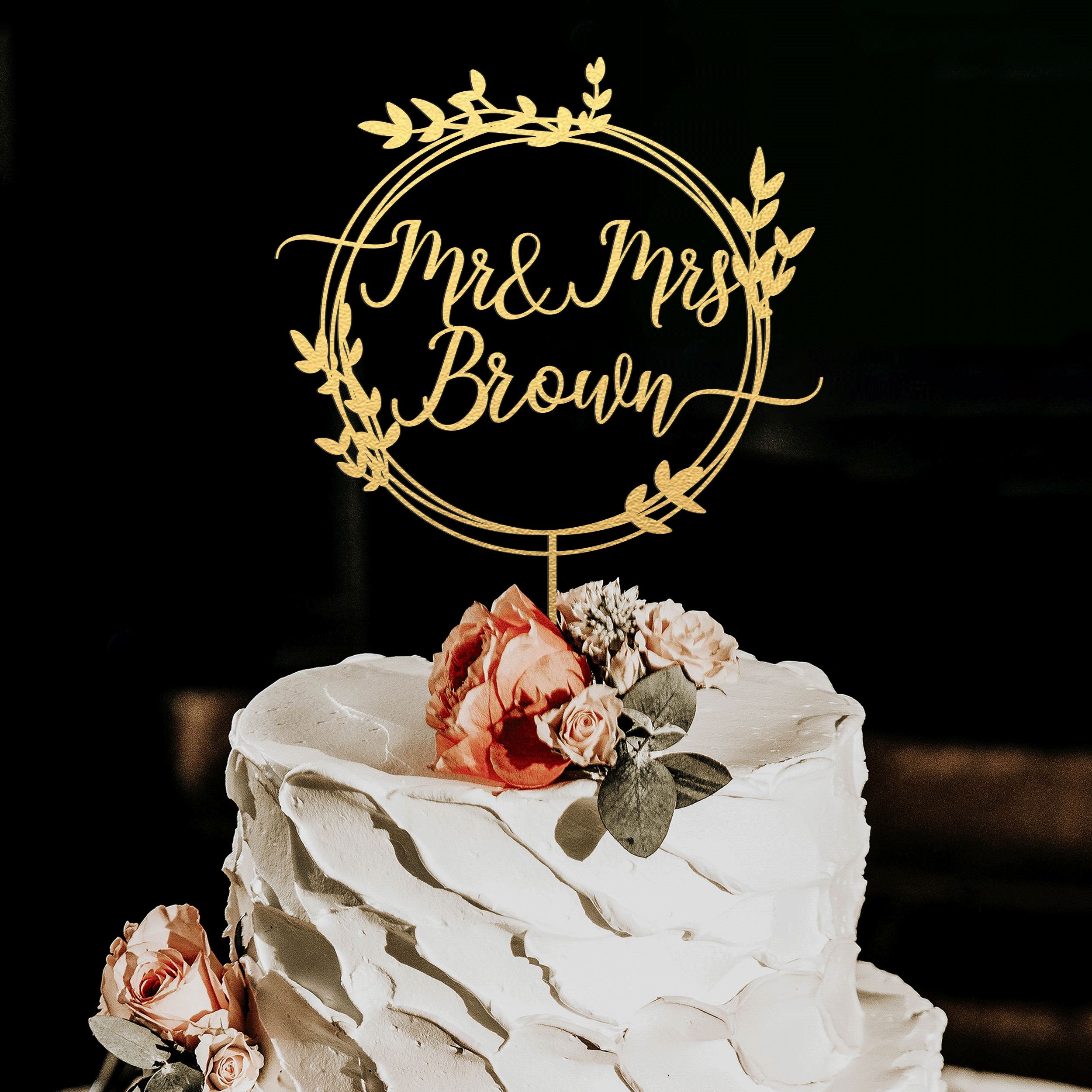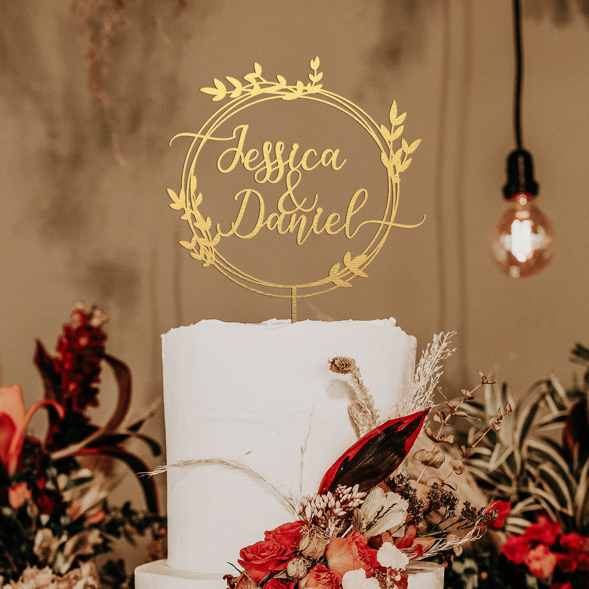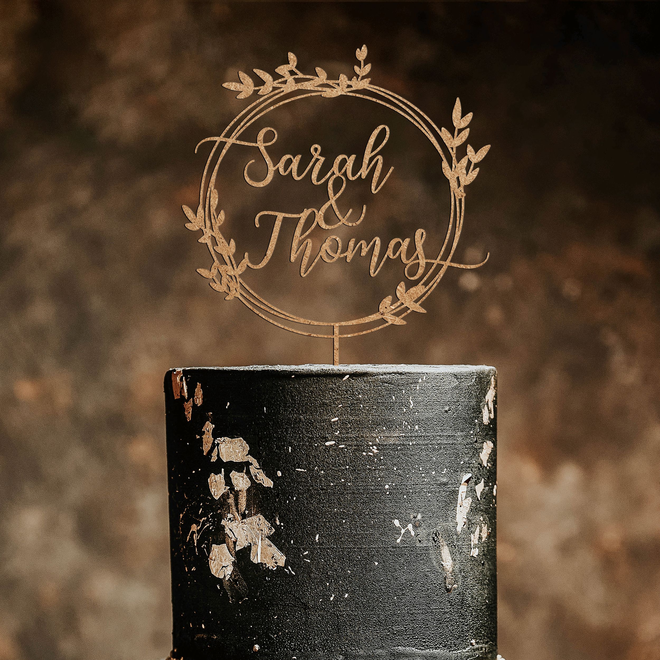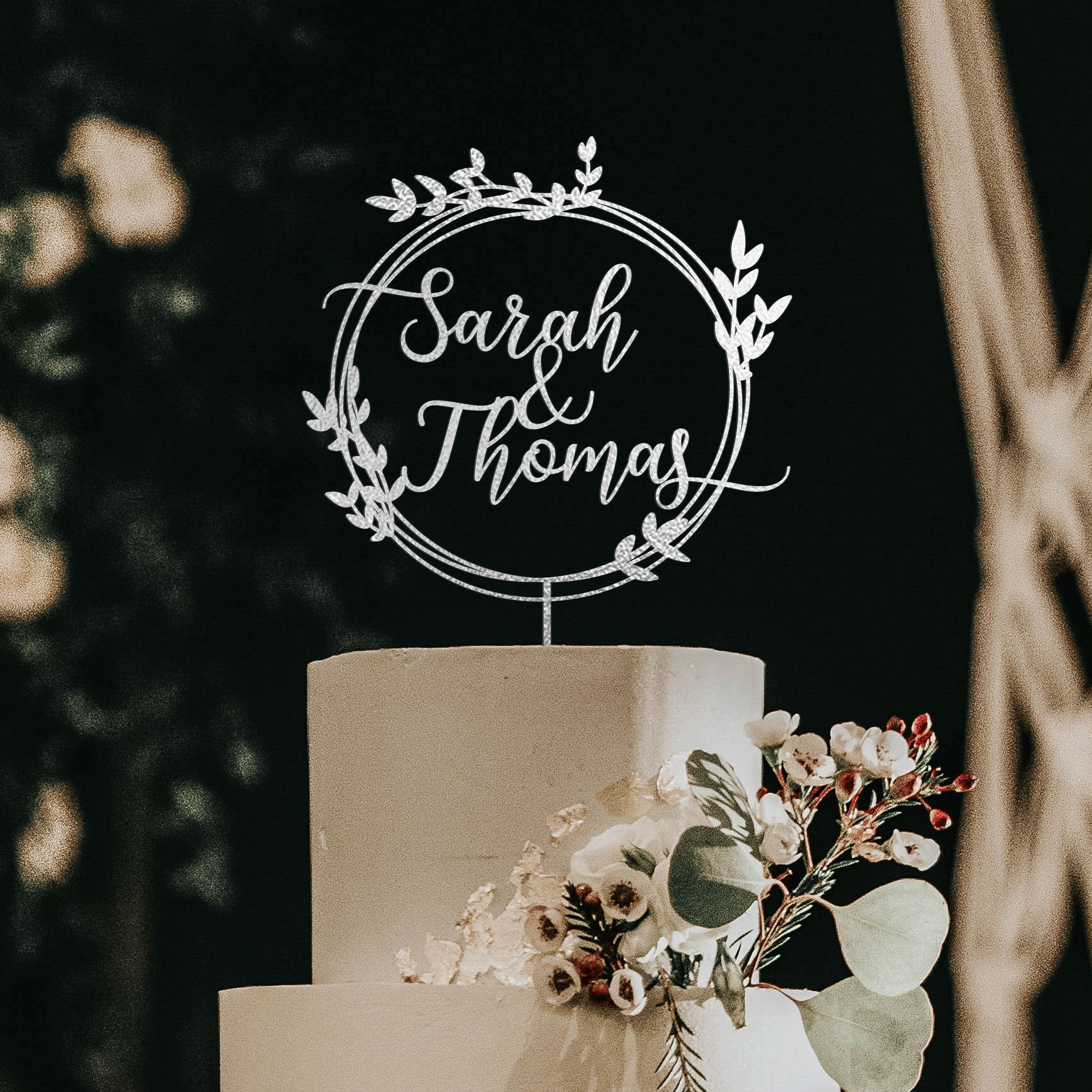 Elegant Greenery Wedding Cake Topper, Custom Names Cake Topper, Floral Wreath Cake Topper for Wedding