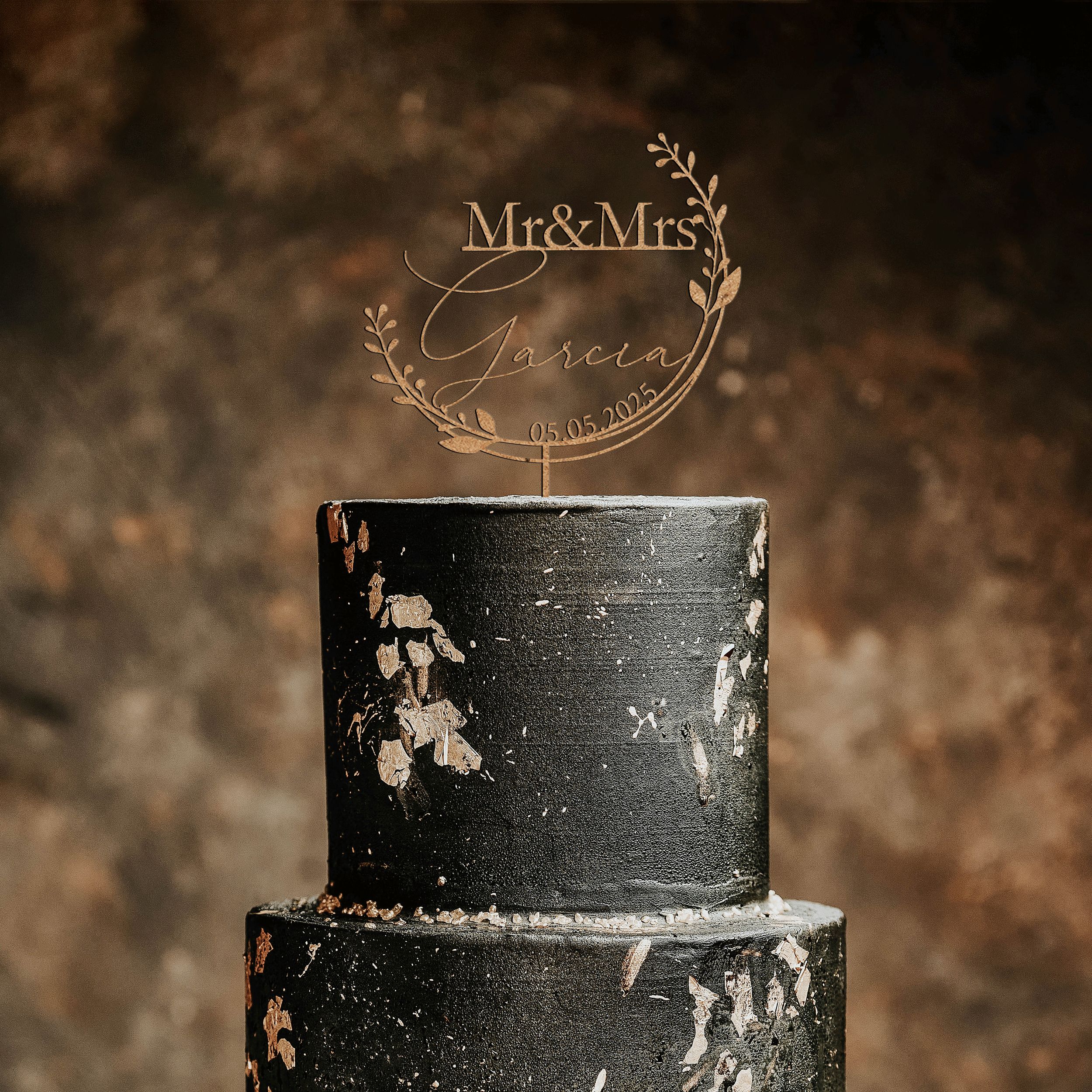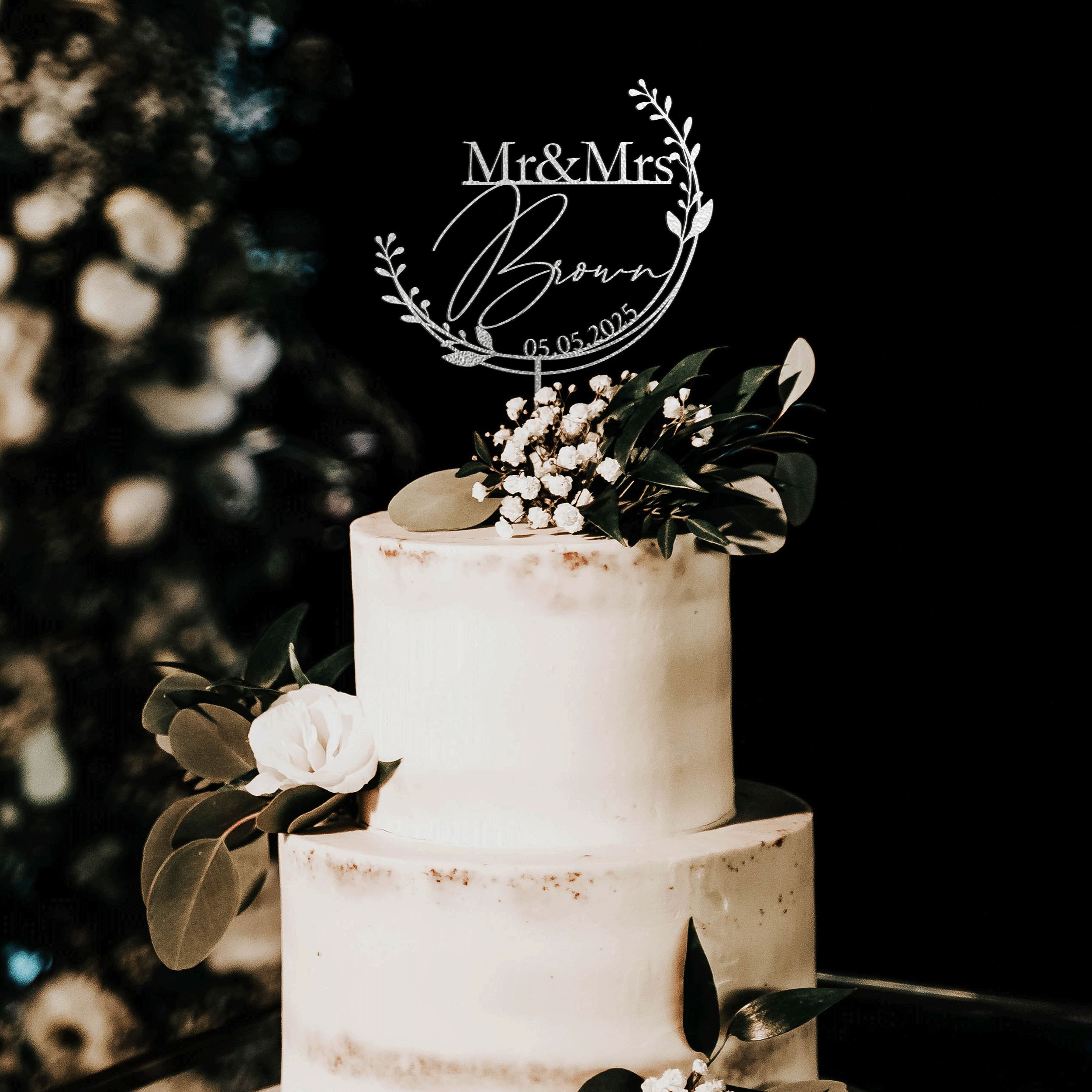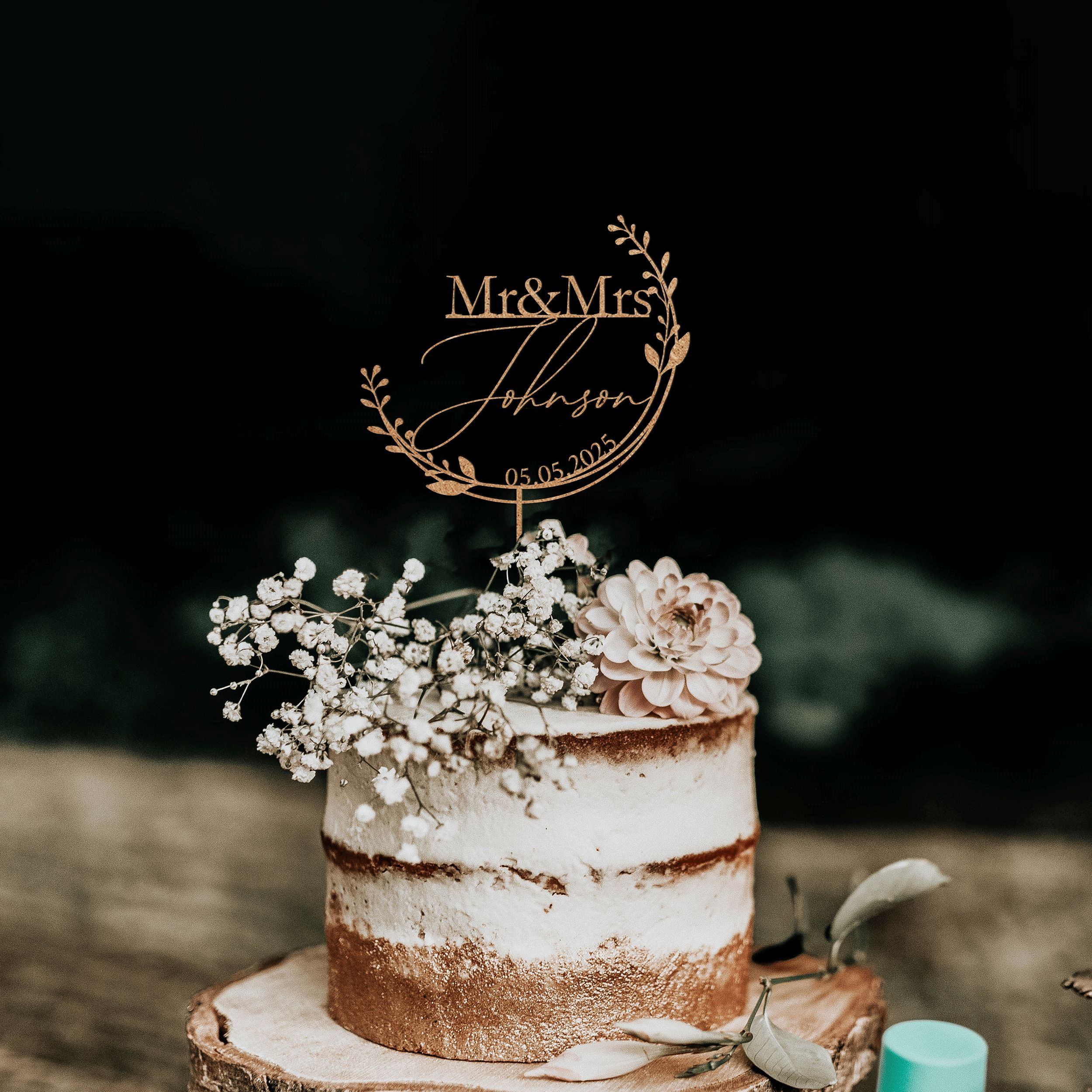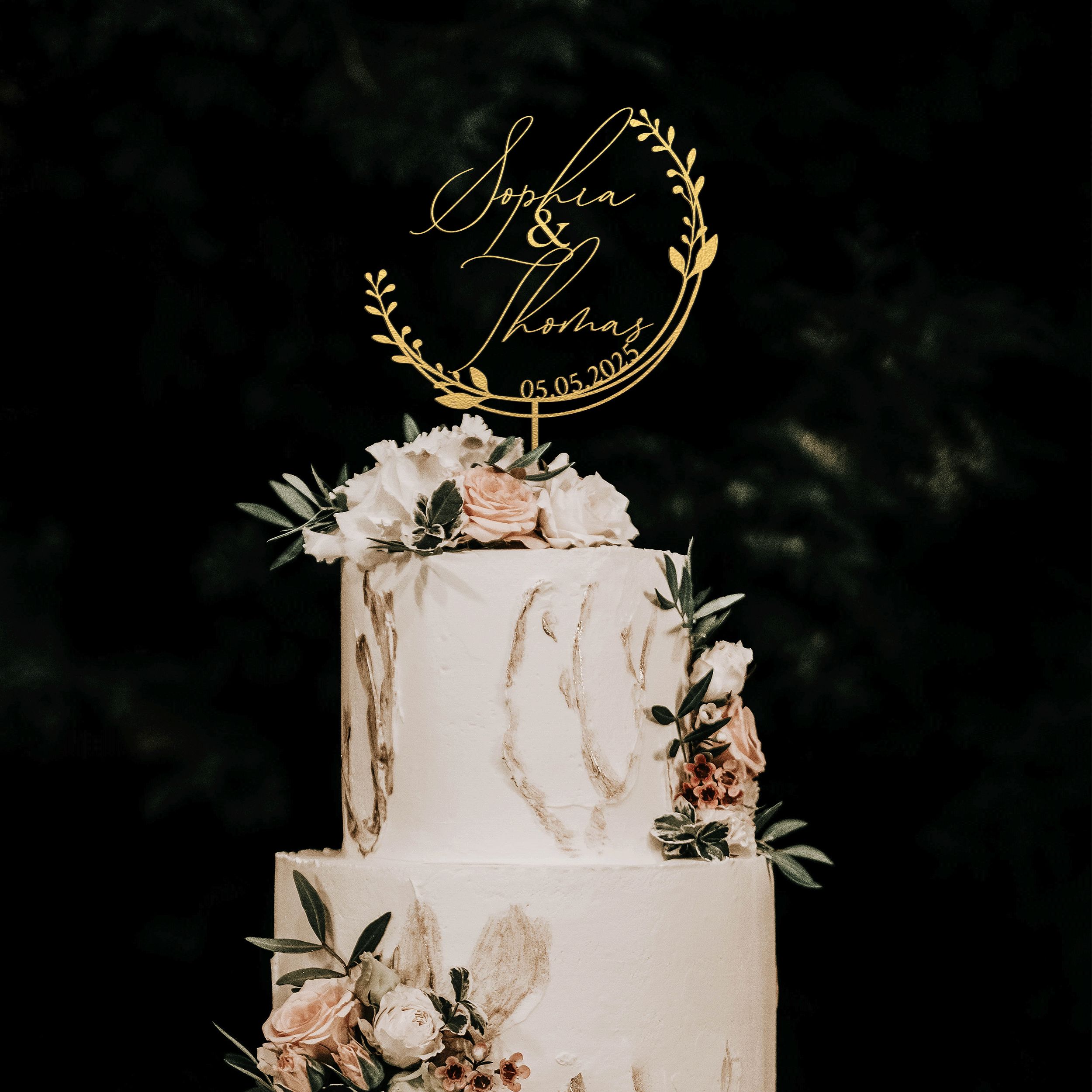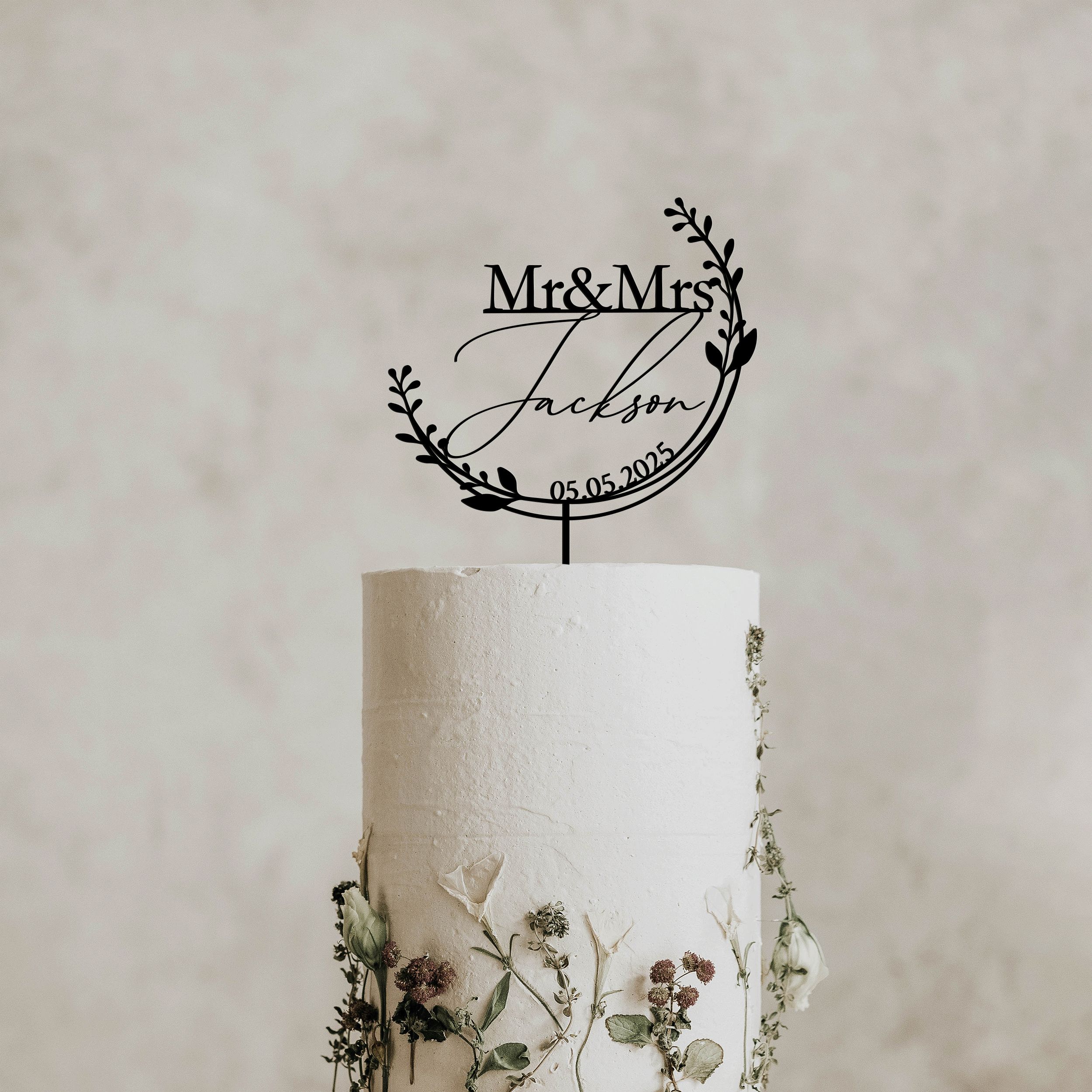 Unique Floral Cake Topper for Wedding, Wreath Wedding Cake Topper, Custom Name and Date Wedding Decor