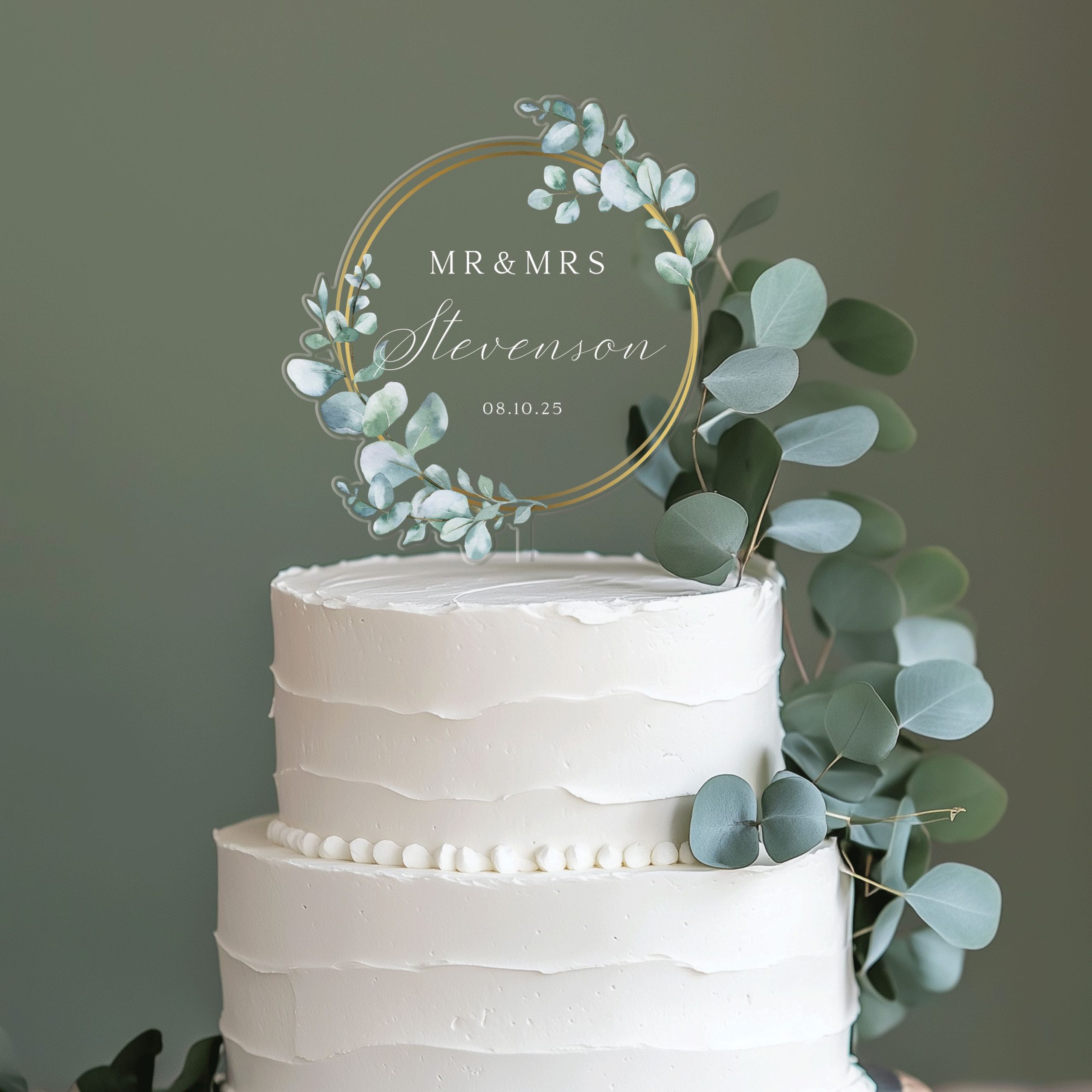 Unique Wedding Cake Topper, Eucalyptus and Gold Cake Topper for Wedding, Mr and Mrs Cake Topper